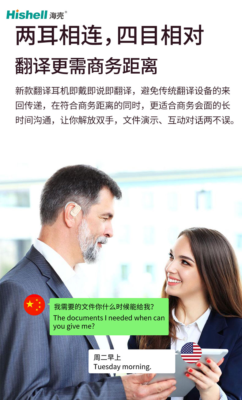 商务会面中,得体的距离感与顺畅沟通缺一不可,这款新款翻译耳机恰好完美兼顾。它采用 “两耳相连” 的便捷设计,无需复杂调试,即戴即说即翻译,彻底告别传统翻译设备来回传递的尴尬,既符合商务场合的社交距离礼仪,又能满足长时间沟通需求。
