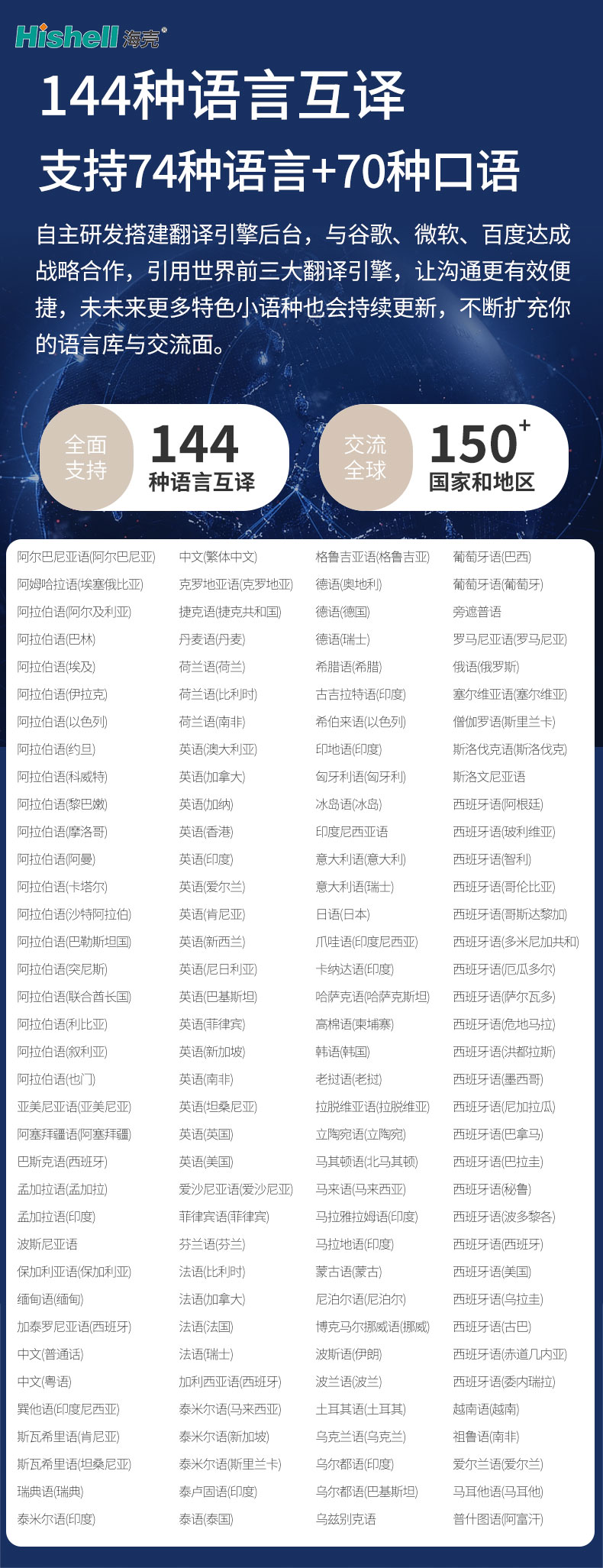 无论是跨国商务洽谈,还是海外深度旅行,这款翻译机都能成为你的 “全能语言助手”,以 144 种语言互译能力轻松应对多元场景,其中涵盖 74 种语言与 70 种口语,从主流语种到地方方言,皆能精准覆盖。