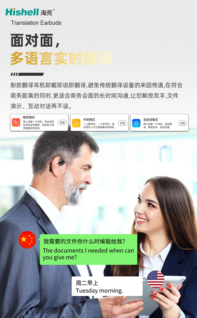 商务会面遇语言壁垒?新款翻译耳机为您破解难题。无需繁琐操作,即戴即说即翻译,支持多语言面对面实时转换,彻底告别传统翻译设备来回传递的尴尬。贴合商务社交距离,轻量化设计适配长时间沟通,让您全程解放双手——演示文件时从容讲解,互动对话中流畅回应,二者兼顾毫无压力。精准的翻译效果与高效的沟通体验,成为您商务洽谈中的得力伙伴,轻松打破语言隔阂,助力合作顺利推进。