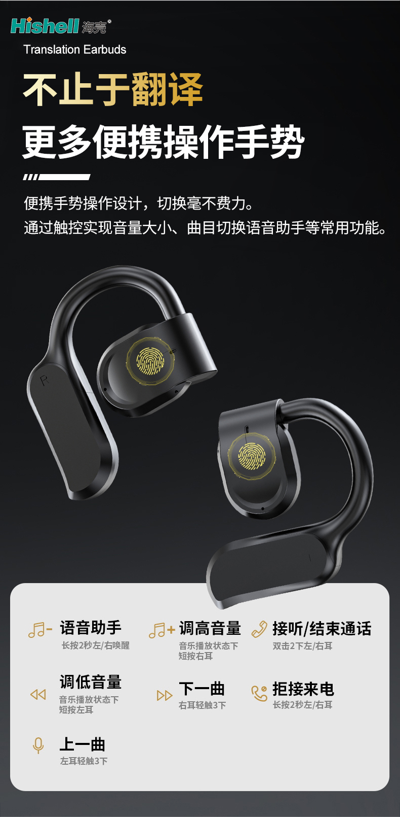 这款智能翻译耳机,打破“仅能翻译”的单一认知,将便捷操作融入每一次使用。机身采用轻量化设计,搭配贴心手势操控,让功能切换告别繁琐。只需轻触耳机面板,即可轻松调节音量大小,无需掏出设备就能随心切换喜爱曲目。遇到需求时,一键唤醒语音助手,解放双手高效交互。其核心翻译功能精准快速,而手势操控的加持更添实用性——通勤路上换歌、办公时调音量、差旅中唤助手,每一步操作都流畅省力,为生活与工作带来全新便捷体验。