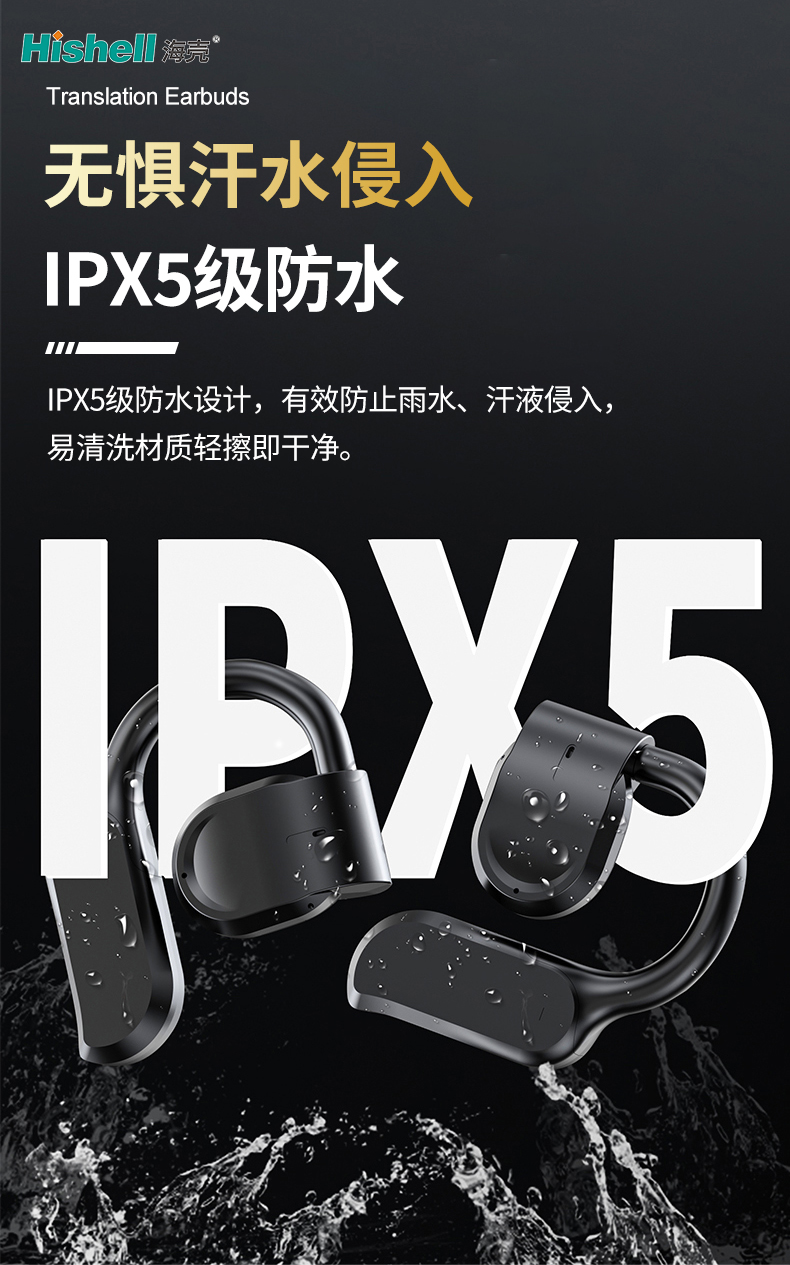 这款智能翻译耳机,以IPX5级防水实力守护你的每一次使用。无论是运动时的淋漓大汗,还是通勤途中的突发小雨,它都能有效抵御液体侵入,告别设备损坏隐患。耳机采用易清洗材质,不慎沾染污渍或汗水,只需用软布轻擦便能恢复洁净。精准翻译功能搭配稳定连接,日常交流、商务洽谈都顺畅无忧。轻量化设计佩戴舒适,防水属性与实用性能兼备,让你在各种场景下都能放心使用,随时开启无界沟通。