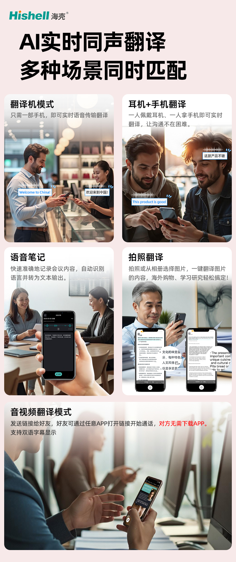 除此之外,耳机还兼具多重实用功能:语音笔记可快速准确记录会议内容,自动识别语言并转为文本输出,提升办公学习效率;拍照翻译功能,只需拍照或从相册选取图片,一键即可翻译图片内容,海外购物、学习研究轻松应对。音视频翻译模式更显便捷,发送链接给好友,对方无需下载任何APP,通过任意应用打开链接即可通话,还支持双语字幕显示,沟通更清晰顺畅。
