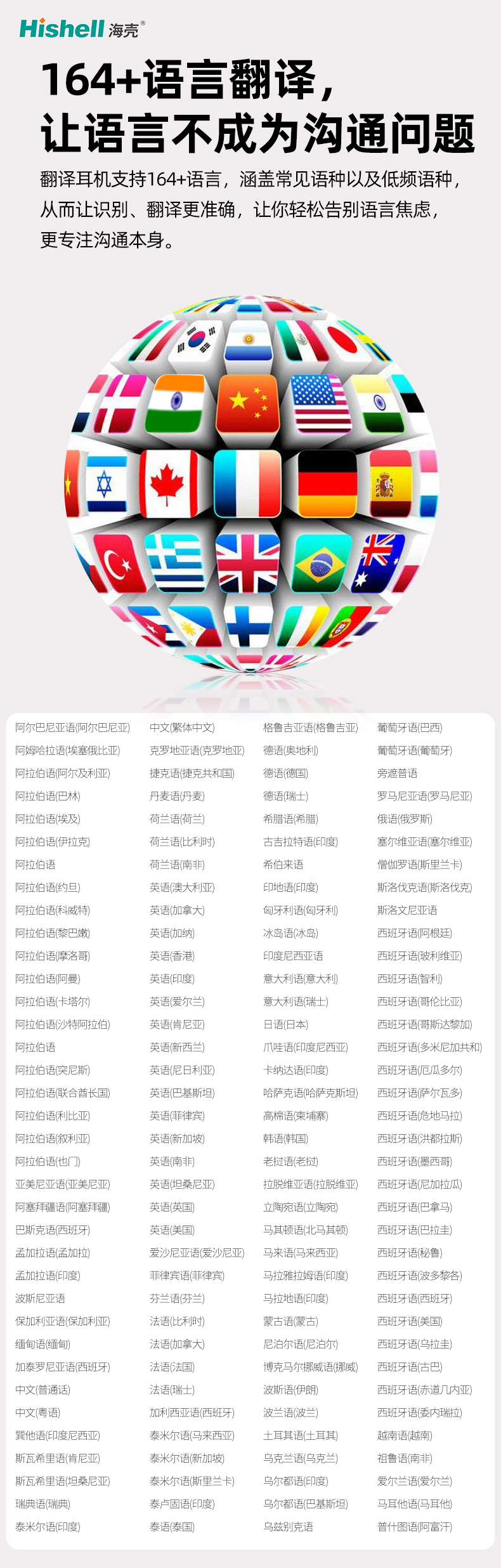 这款翻译耳机以“打破语言壁垒,专注纯粹沟通”为核心,搭载强大的翻译引擎,支持164+种语言实时互译,全方位覆盖全球常见语种与各类低频小众语种,无论是主流的英、日、德、法,还是小众的冷门语种,都能实现精准识别与高效翻译,彻底解决跨语言沟通的核心痛点。