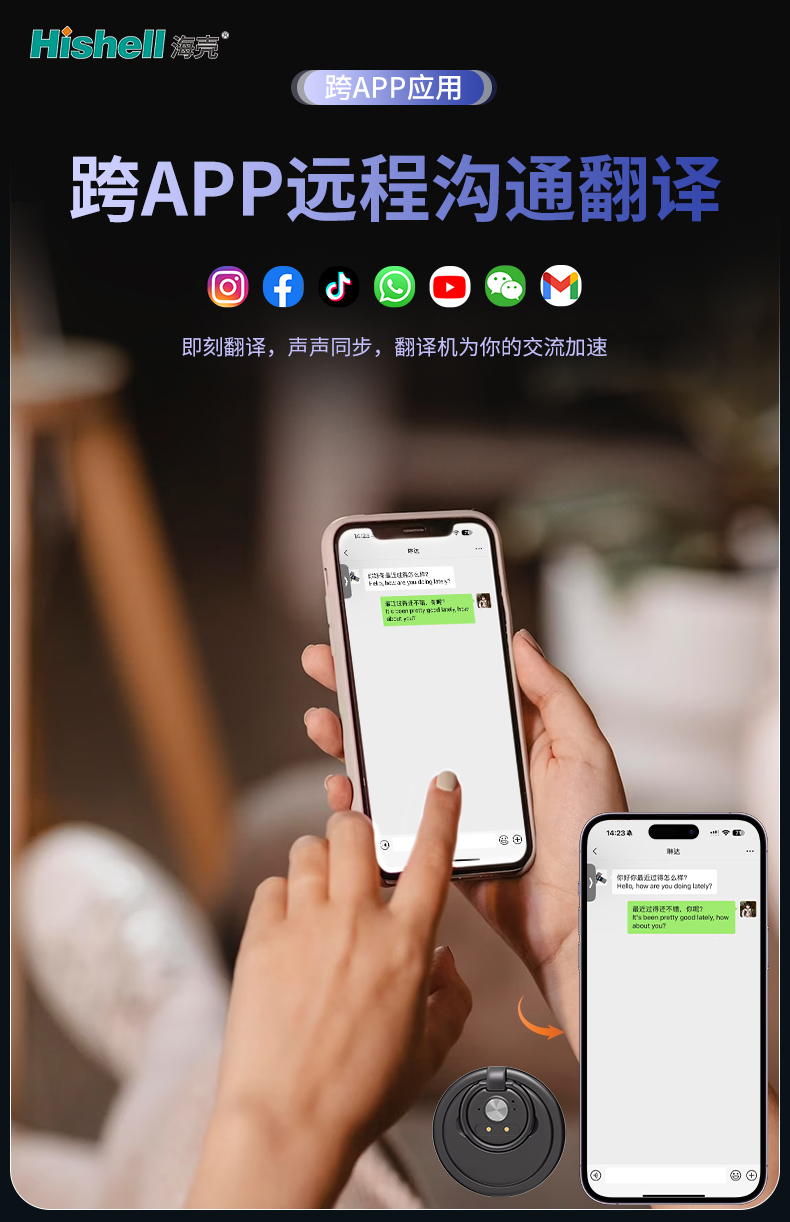 搭载高效AI翻译引擎,精准识别多语种语音与文本,兼顾口语化表达与专业术语,翻译准确率高,贴合真实沟通场景。无需复制粘贴,无需手动触发,跨APP场景下一键启用,轻松解决跨国聊天、外贸沟通、海外交友等多种需求。机身轻巧便携,操作简单易懂,兼顾实用性与便捷性,随时随地打破语言壁垒,让跨APP远程沟通更顺畅、更高效,成为你日常交流、商务洽谈的贴心翻译伙伴。