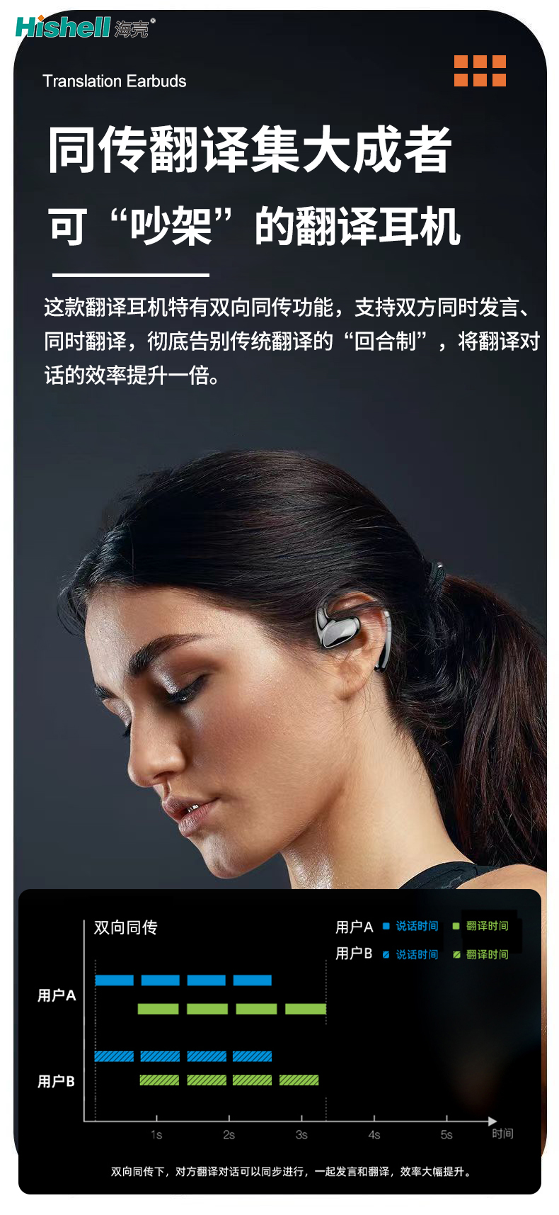 轻量化设计贴合耳廓,久戴无负担;高清音质滤除环境杂音,确保每一句沟通都清晰无误。让语言壁垒在专业中消弭,让商务交流在便捷中升温,这款翻译耳机,是你驰骋国际商务场的得力伙伴。