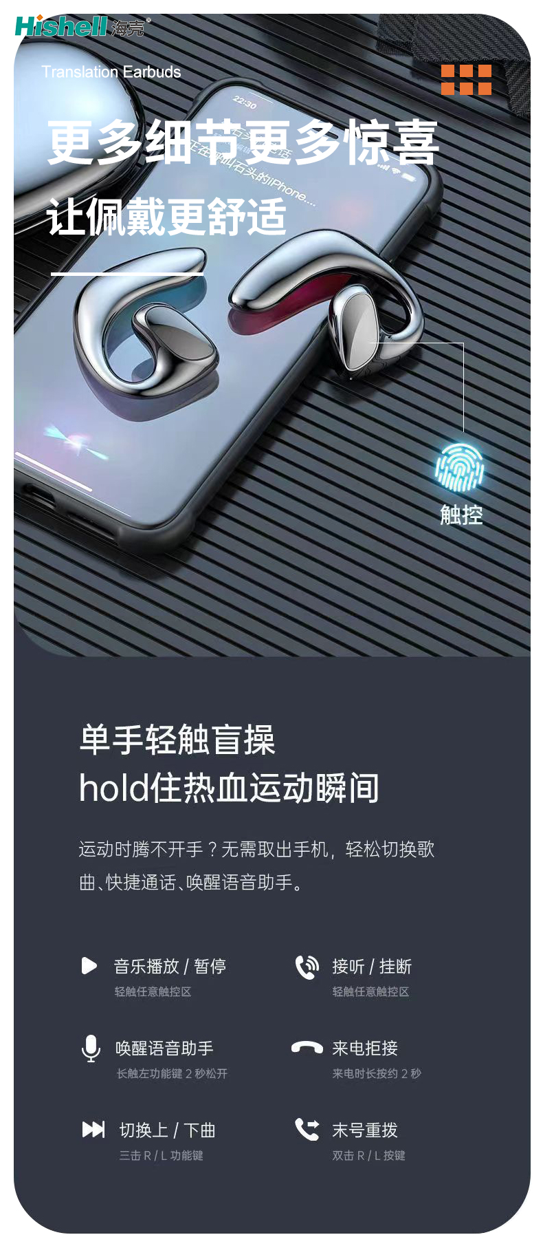 这款智能翻译耳机,藏着更多细节与惊喜。人体工学设计贴合耳道,轻量化材质让佩戴感再升级,久戴也无负担。单手轻触即可完成盲操作,精准响应不耽误分毫,热血运动瞬间也能轻松hold住。运动时腾不开手?无需取出手机,轻触耳机就能切换歌曲、接听挂断通话,还能快速唤醒语音助手,指令随叫随到。实时翻译功能精准高效,日常交流、跨境出行都好用,运动与沟通的需求,它一次满足。