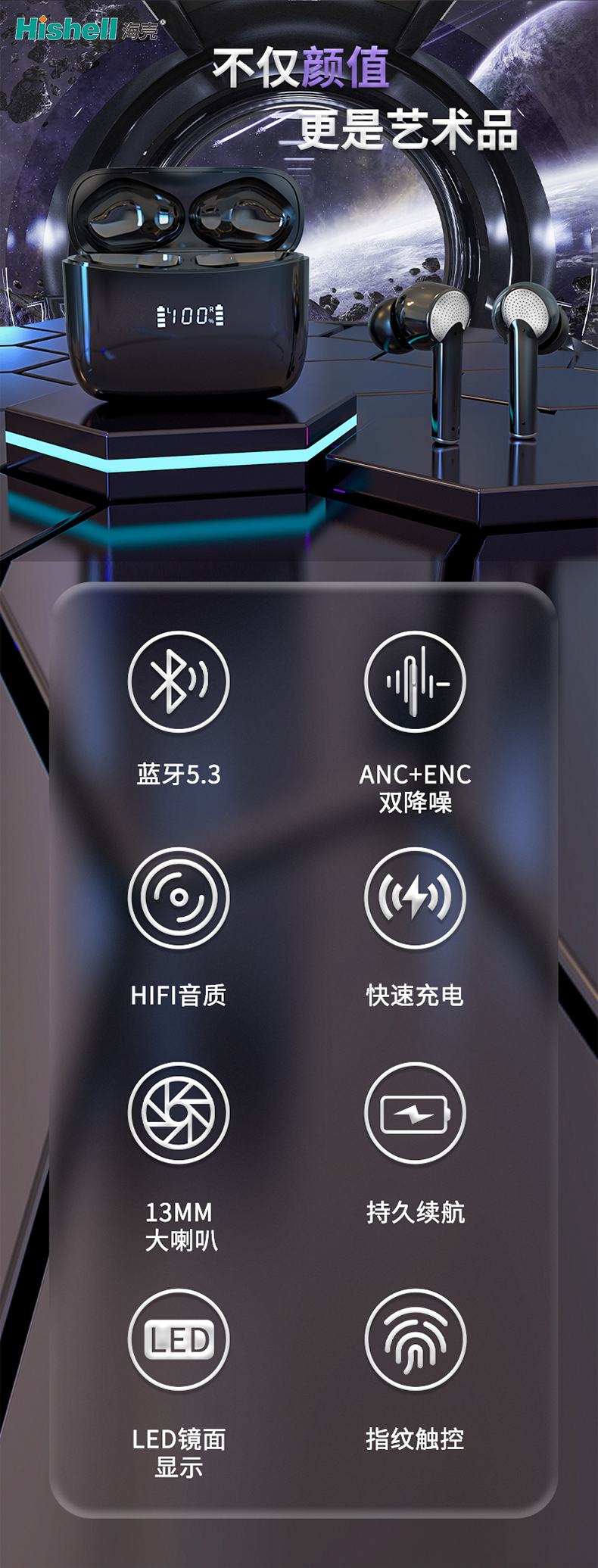 这款蓝牙耳机,不仅颜值出众,更堪称可随身携带的艺术品。核心搭载蓝牙5.3芯片,连接稳定且延迟超低,开盖秒连不卡顿。ANC+ENC双降噪加持,精准抵消环境噪音,通话时清晰过滤杂音,静谧聆听与高清通话一键拥有。内置13mm大喇叭单元,搭配专业HIFI音质调校,三频均衡饱满,沉浸式听觉盛宴即刻开启。支持快速充电,碎片时间就能满血复活,搭配持久续航,告别电量焦虑。LED镜面显示直观呈现电量状态,指纹触控操作精准便捷,每一处细节都尽显匠心与质感。