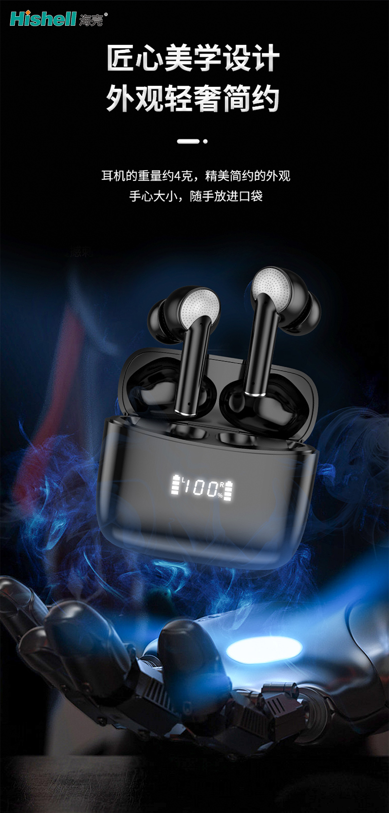 这款蓝牙耳机以匠心雕琢美学细节,整体采用轻奢简约设计风格,线条流畅柔和,配色高级内敛,兼具科技质感与时尚格调,既是音频设备,亦是便携穿搭单品。单耳重量仅约4克,佩戴时轻若无物,久戴无胀痛感。充电盒掌心可握,精致小巧的身形随手就能放入口袋或小包,无需额外收纳,通勤、出游携带毫无负担。每一处细节都尽显用心,让你在享受便捷音频体验的同时,也能彰显独特品味。