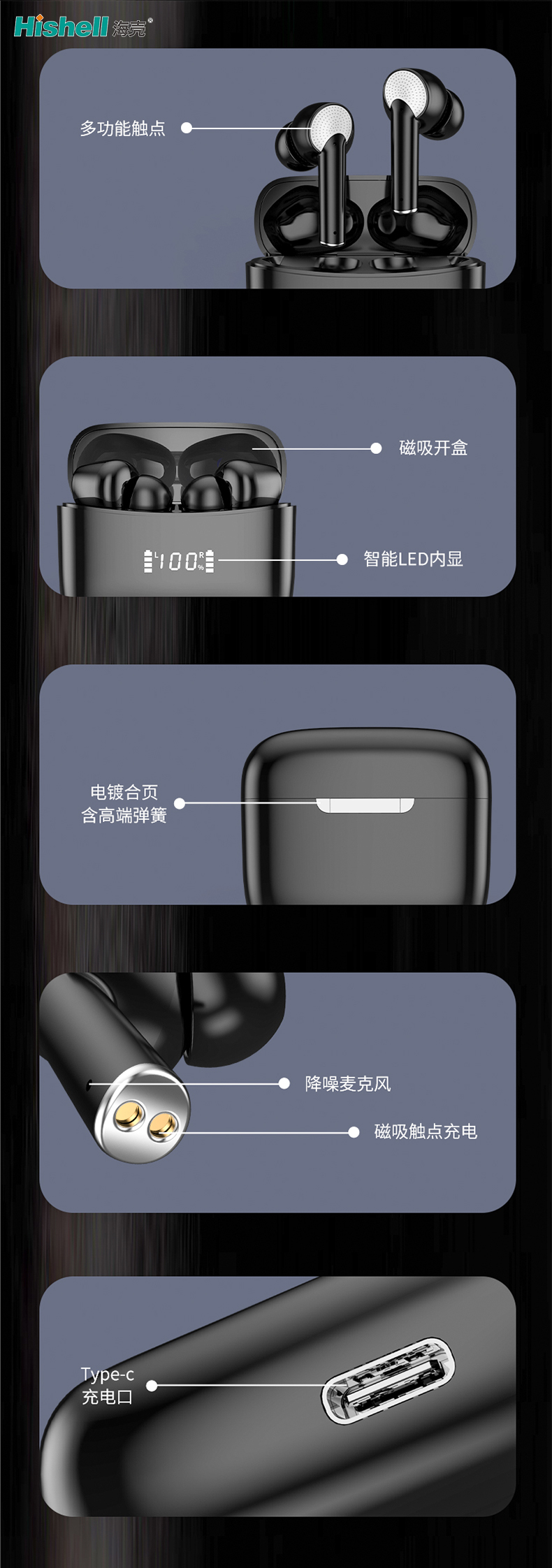 这款蓝牙耳机集多项高端配置于一身,兼顾实用与质感。采用多功能触点设计,操作精准便捷,轻松实现播放、暂停等核心功能。创新磁吸开盒设计,开合顺滑不卡顿,兼具防误开与仪式感。智能LED内显清晰直观,实时反馈电量状态,告别电量焦虑。电镀合页搭配高端弹簧,质感出众且经久耐用,开合手感细腻高级。内置降噪麦克风,精准过滤环境杂音,通话音质清晰稳定,无论是日常沟通还是会议交流都游刃有余。磁吸触点充电设计,吸附即充,高效便捷,为你的出行与使用保驾护航。