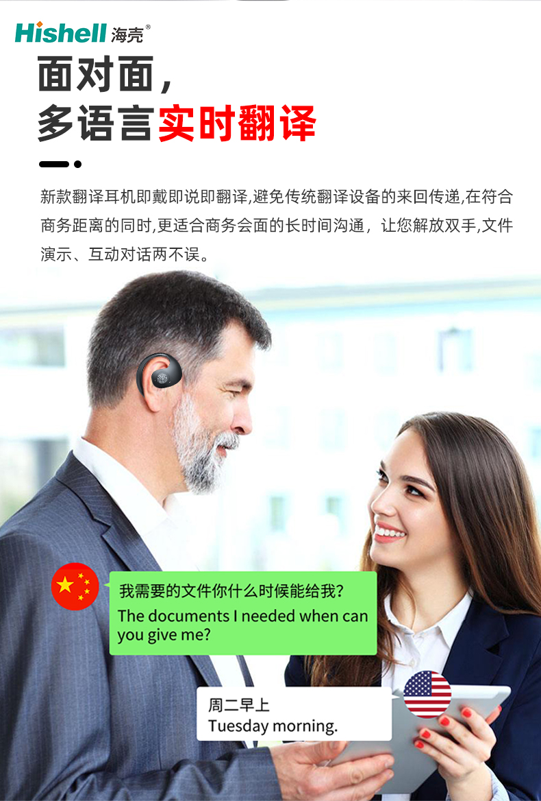 新款翻译耳机主打面对面多语言实时翻译,颠覆传统翻译设备的使用模式,即戴即说即翻译,无需来回传递设备,精准契合商务社交距离,适配商务会面中的长时间沟通场景。它让使用者彻底解放双手,既能专注进行文件演示、数据讲解,又能顺畅开展双向互动对话,兼顾高效办公与流畅沟通,破解跨语言商务洽谈的沟通壁垒。