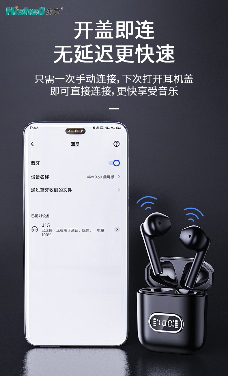 这款蓝牙耳机以便捷连接与极速体验重塑听觉享受,搭载霍尔感应技术,实现真正的开盖即连。首次使用仅需一次手动配对,后续每次打开充电盒盖,耳机便自动唤醒并秒连已配对设备,无需反复操作,拿起就能沉浸音乐世界。内置高性能旗舰芯片与双路传输技术,大幅降低延迟,无论是追剧看片还是激战游戏,音画始终同步,告别声画脱节的尴尬。连接稳定且响应快速,通勤路上取戴、办公切换设备都无需等待,让每一次聆听都高效又顺畅,轻松适配日常各种使用场景。