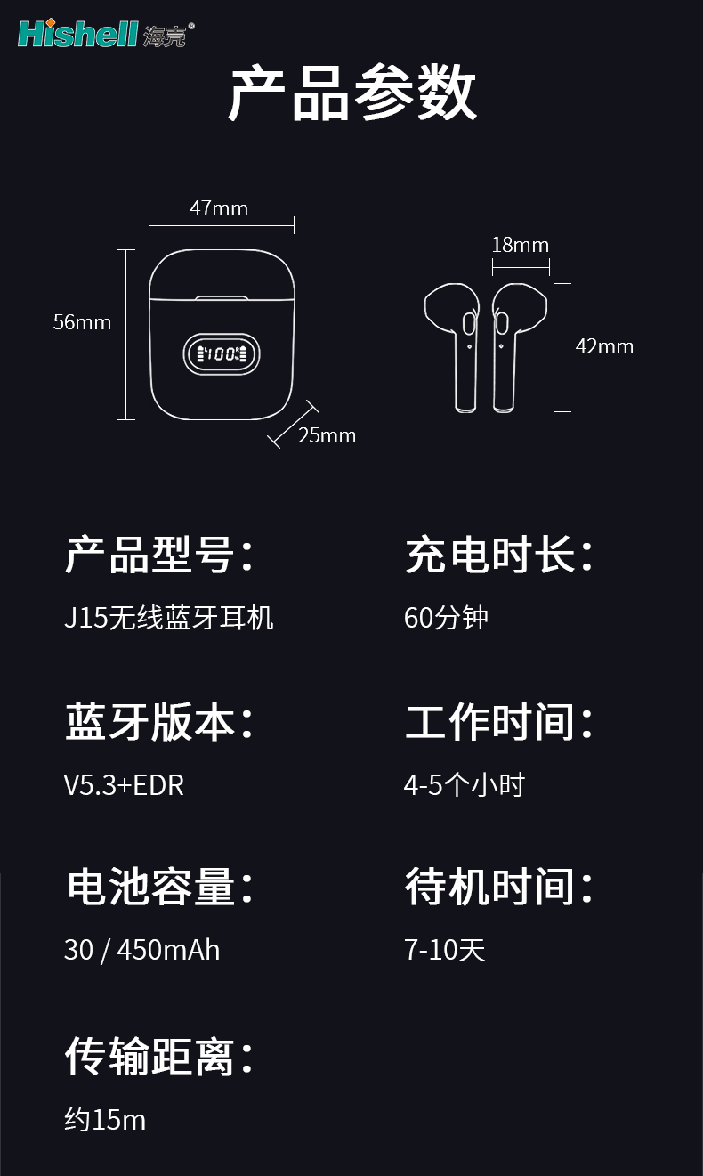 产品型号:J15无线蓝牙耳机 充电时长:60分钟