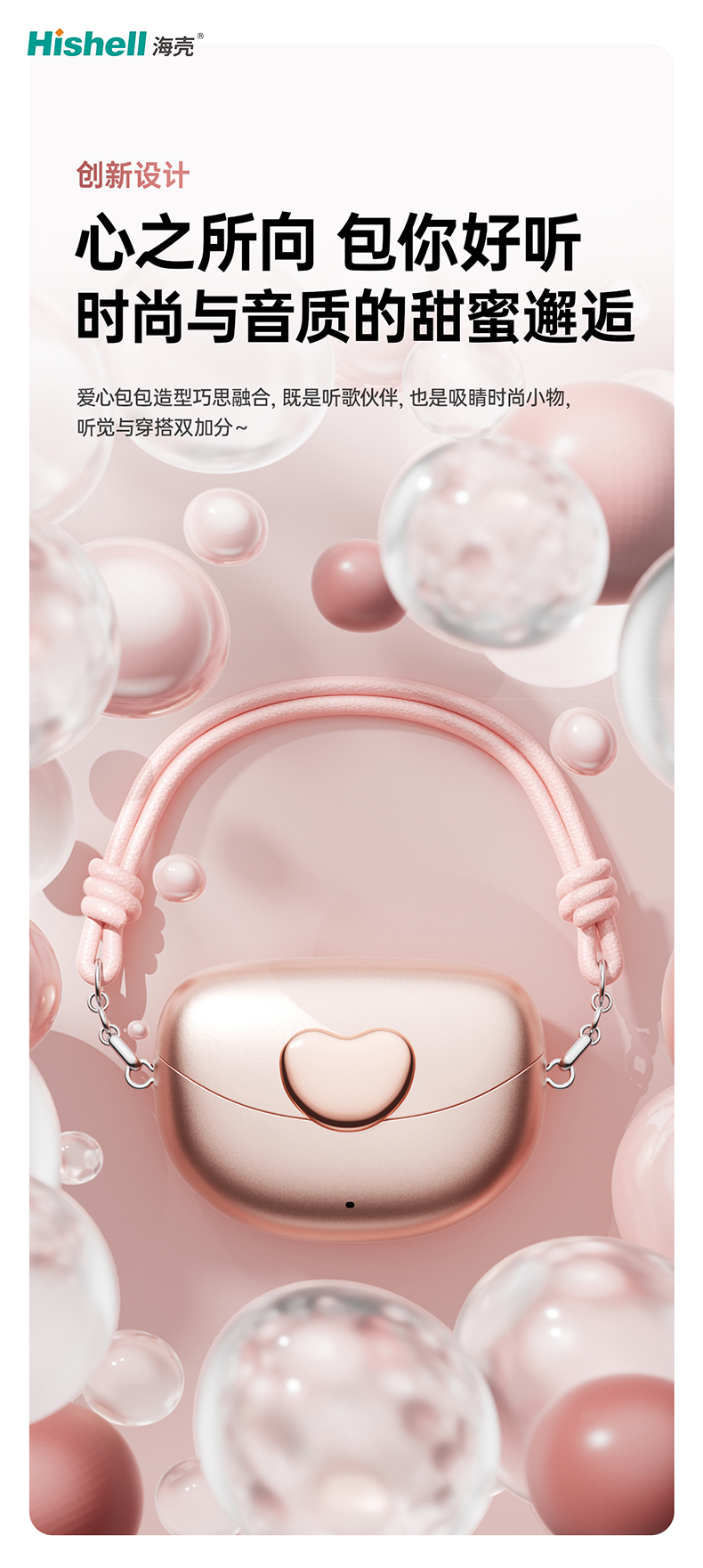 机身采用精致爱心包包轮廓,小巧便携且颜值出众,不管是日常通勤、闺蜜约会还是外出旅行,随手一放就是氛围感配饰,轻松拿捏时尚格调。音质上更是诚意满满,高清立体发声,低音醇厚、高音通透,还原原声质感,让每一段旋律都清晰动听,真正实现“心之所向,包你好听”。