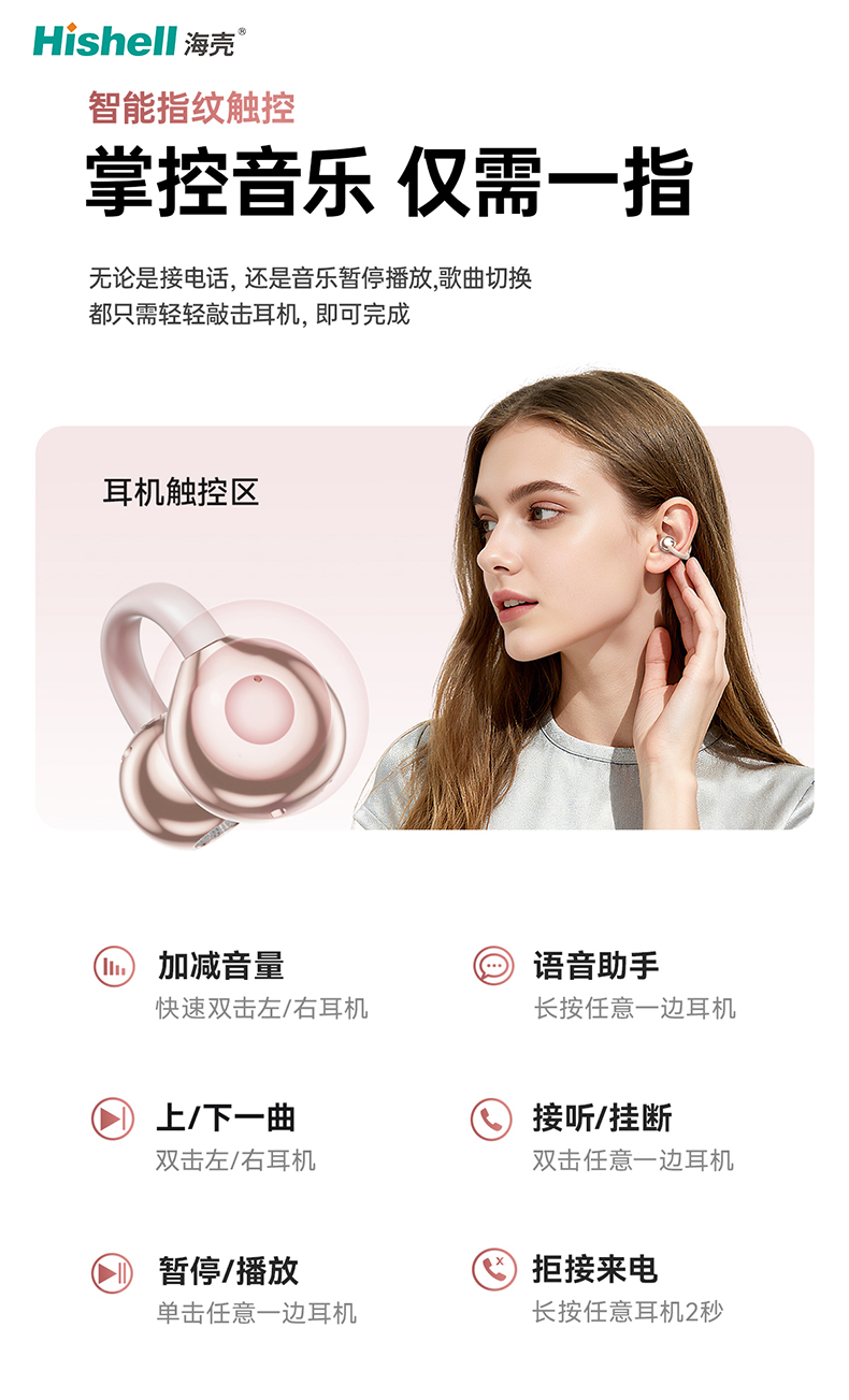搭载灵敏指纹触控技术,反应迅速且精准,告别传统物理按键的繁琐与磨损。无论是日常接打电话,只需轻轻敲击耳机,即可快速接通或挂断,解放双手更省心;聆听音乐时,指尖轻触便能实现暂停、播放切换,上下曲目切换也无需操作手机,随心掌控听觉节奏,通勤、运动、办公时使用更便捷。