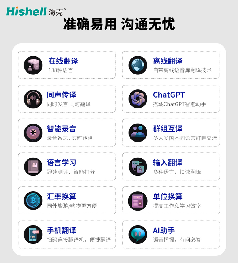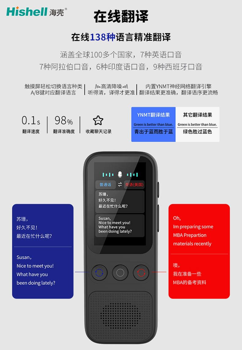 在 “听得清” 上,其搭载高灵敏度麦克风,能有效过滤环境噪音,即便在嘈杂的商场、车站等场景,也能清晰捕捉语音;“听得懂” 则依赖先进的语音识别技术,可精准理解不同语境下的表达;“译得准”“译得快” 则依托强大的翻译引擎,实现毫秒级响应与高准确率翻译。此外,它还具备外语教学功能,能通过跟读练习、单词讲解等方式教你学外语,既是沟通工具,也是学习伙伴,满足多元需求。