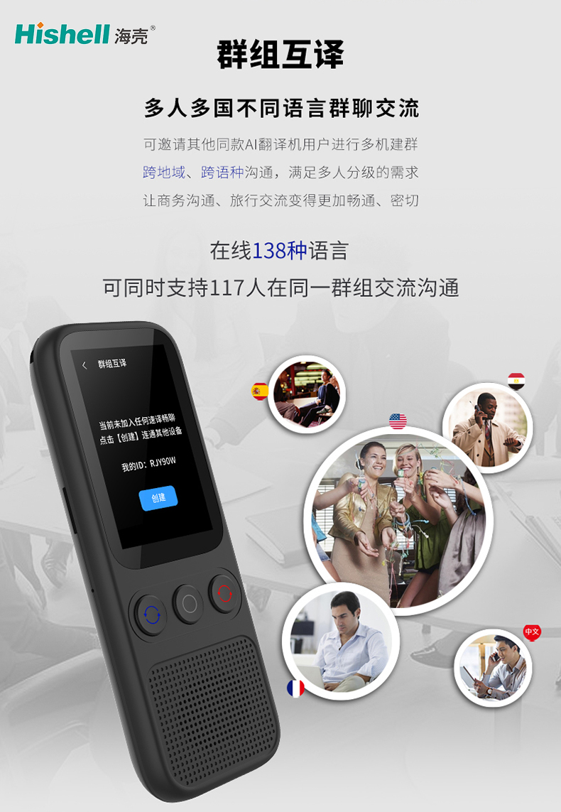 S80 智能翻译机的群组互译功能,专为多人多国语言交流设计,轻松化解多语种群聊难题。它支持邀请其他同款 AI 翻译机用户多机建群,无论身处不同地域,持有同款设备即可加入群组,实现跨地域、跨语种实时沟通。