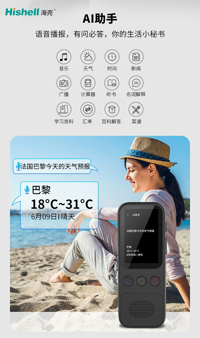 S80 智能翻译机的 AI 助手,以 “语音播报、有问必答” 为核心,化身贴心生活小秘书,覆盖多元日常需求。只需语音指令,就能轻松调用丰富功能:想听音乐放松、查询实时天气、了解当前时间,或是获取最新新闻、收听广播节目,AI 助手都能快速响应。