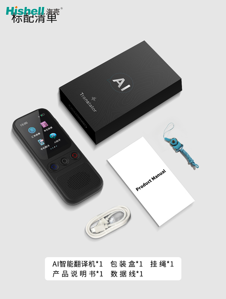 标配清单:AI智能翻译机*1,包装盒*1,挂绳*1,产品说明书*1,数据线*1