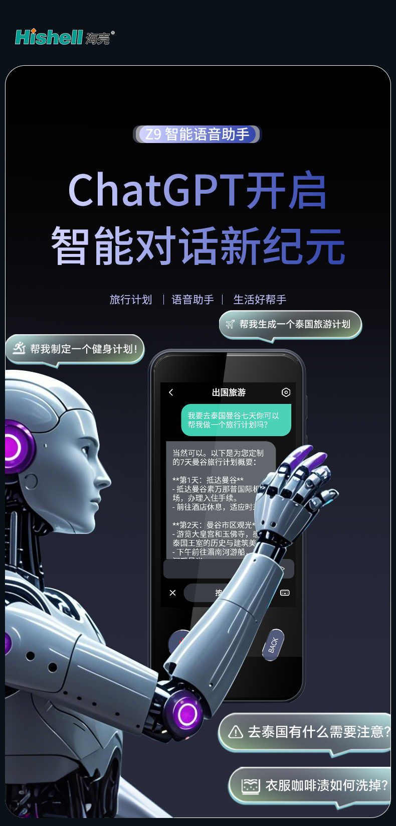 Z9智能语音助手,搭载ChatGPT开启智能对话新纪元!作为全能翻译神器,它支持多语种精准互译,覆盖全球主流语言及多种口音,离线模式下也能稳定输出,嘈杂环境中凭借双麦降噪技术依旧清晰收音。无论是出国旅行时的点餐、问路、景点沟通,还是日常生活中的外语学习、跨境交流,它都能秒速响应。更能化身贴心助手,帮你规划旅行计划、解答各类疑问。小巧便携,功能强大,打破语言壁垒,既是你的旅行好搭档,也是提升生活便捷度的智能伙伴,让跨语言沟通轻松无忧。