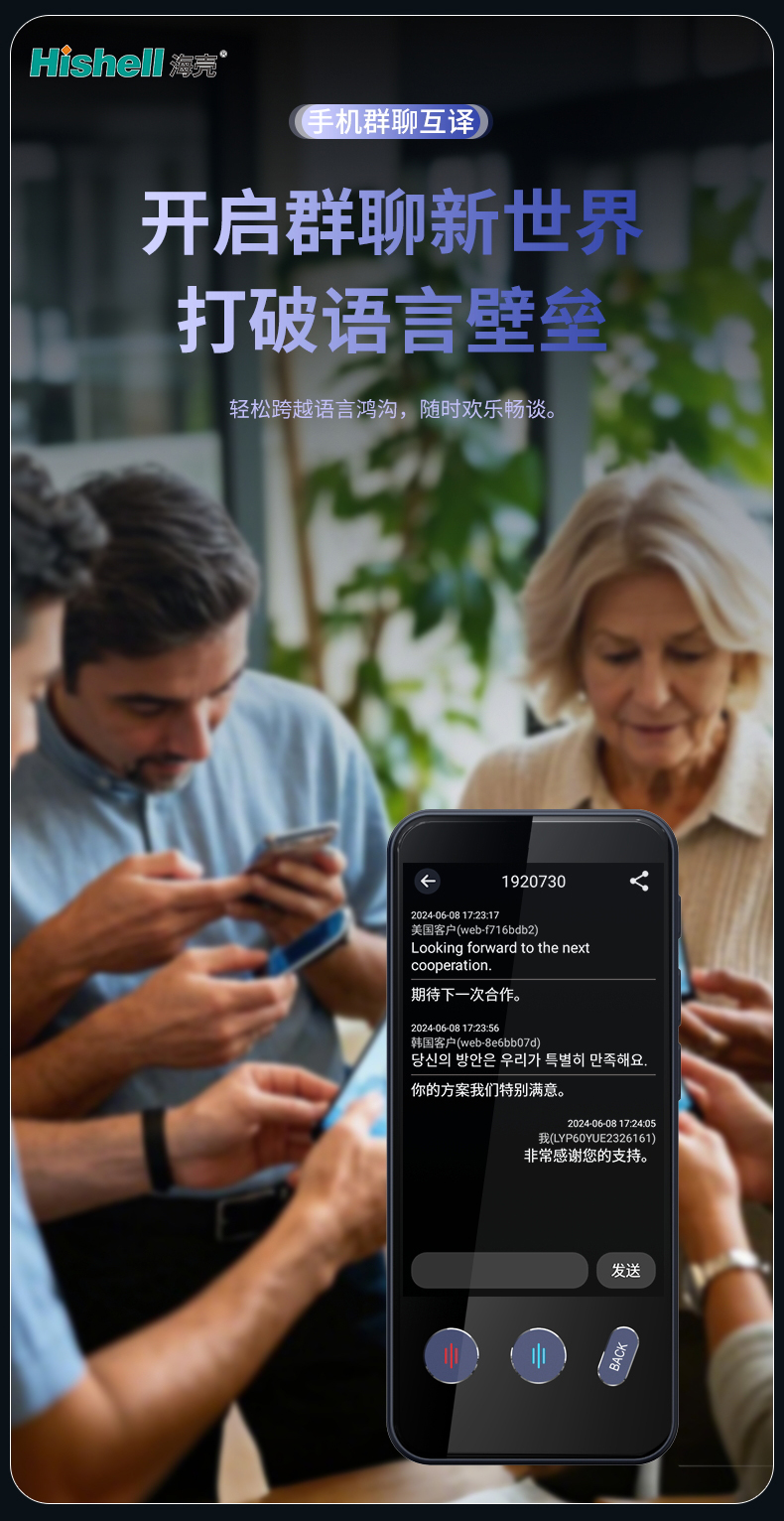 这款翻译机专为手机群聊场景量身打造,一键开启群聊互译模式,为你解锁跨语言交流新世界。无论群内成员使用何种语言发言,都能实时精准翻译,瞬间打破语言壁垒,让沟通无阻碍。无需手动切换语言、逐句输入翻译,轻松跨越语言鸿沟,不管是跨国工作沟通、海外亲友相聚,还是国际社交互动,都能让你和伙伴们随时欢乐畅谈,畅聊无忧,尽享高效便捷的跨语言群聊体验。