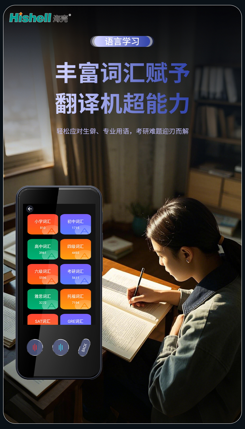 这款专为语言学习者打造的翻译机,以丰富词汇储备赋予核心“超能力”,是攻克语言难题的实用帮手。它覆盖海量词汇,既能精准翻译日常生僻表达,更能轻松应对各专业领域术语,从四六级到考研英语,各类复杂句式、冷门词汇都能快速给出准确译文与详细解析。搭配便捷操作与清晰发音,不仅助力高效理解,更能辅助词汇积累与句式学习,让考研英语等语言难关迎刃而解,为语言学习之路扫清障碍。