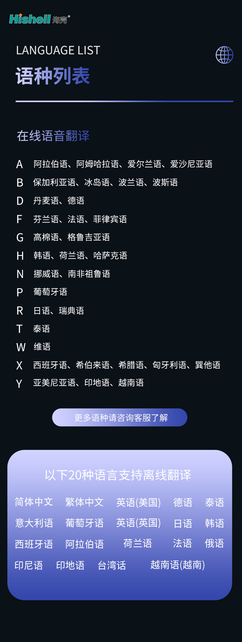 简体中文、繁体中文、英语(美国)、德语、泰语、意大利语、葡萄牙语、英语(英国)、日语、韩语、西班牙语、阿拉伯语、荷兰语、法语、俄语、印尼语、印地语、台湾话、越南语(越南)