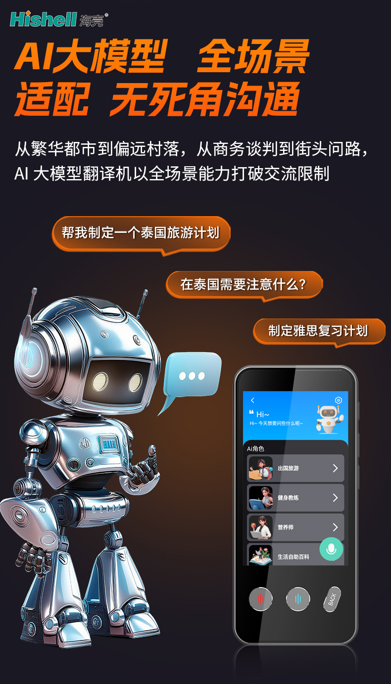 这款AI大模型翻译机,以强大的智能算法为核心,主打全场景适配能力,助力无死角跨语言沟通,打破地域与语言的壁垒。无论是繁华都市的商务谈判、跨境会议,还是偏远村落的日常交流、出行问路,它都能稳定发挥,精准适配各类场景需求。