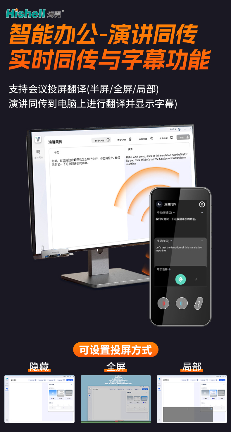 针对会议场景,设备支持灵活的投屏翻译模式,可根据会场需求自由切换半屏、全屏、局部投屏,适配不同规模会议的展示需求,确保所有参会者清晰查看翻译内容。同时,它支持将演讲内容同传至电脑端,翻译结果同步在电脑屏幕显示字幕,既方便演讲者把控节奏,也便于参会者同步记录重点,适配PPT演讲、跨国会议等多种办公场景。