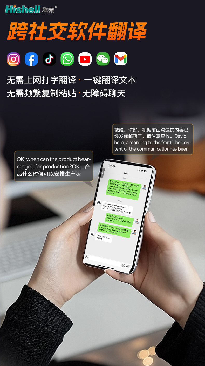 这款翻译机专为跨社交软件沟通设计,彻底解决多平台聊天翻译的繁琐难题,让跨语言交流更高效、更流畅。它支持主流社交软件适配,无论你使用微信、QQ、抖音等任何社交平台,均可直接在软件内完成翻译,无需切换应用,打破平台壁垒。