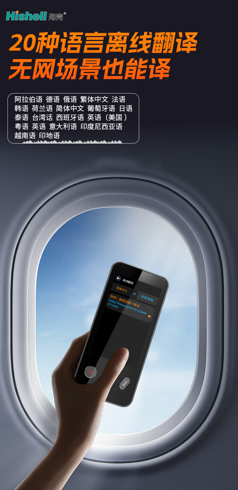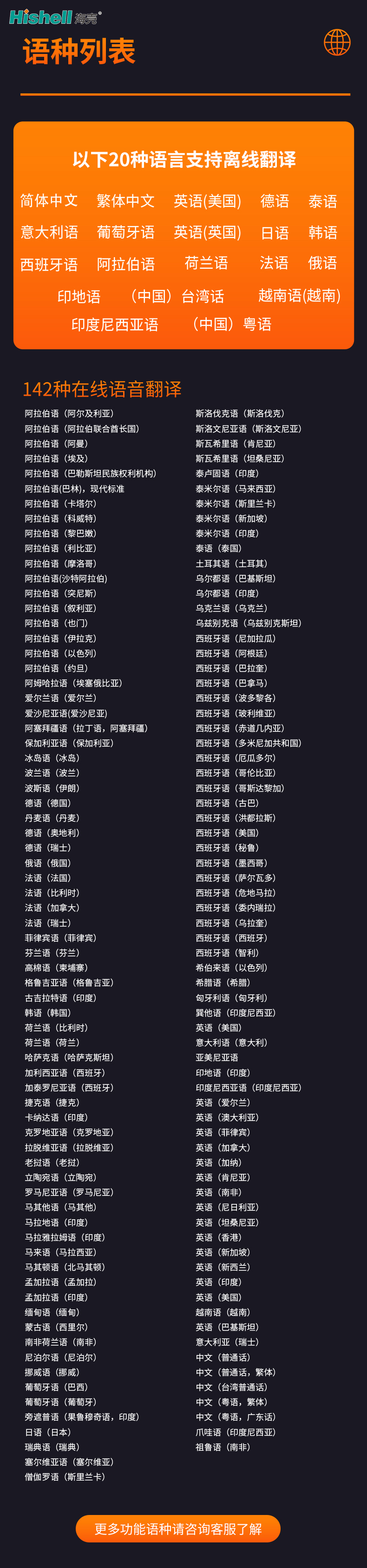 20种离线语言:简体中文、繁体中文、英语(美国)、德语、泰语、意大利语、葡萄牙语、英语(英国)、日语、韩语、西班牙语、阿拉伯语、荷兰语、法语、俄语、印地语、台湾话(中国)、越南语(越南)、印度尼西亚语、粤语