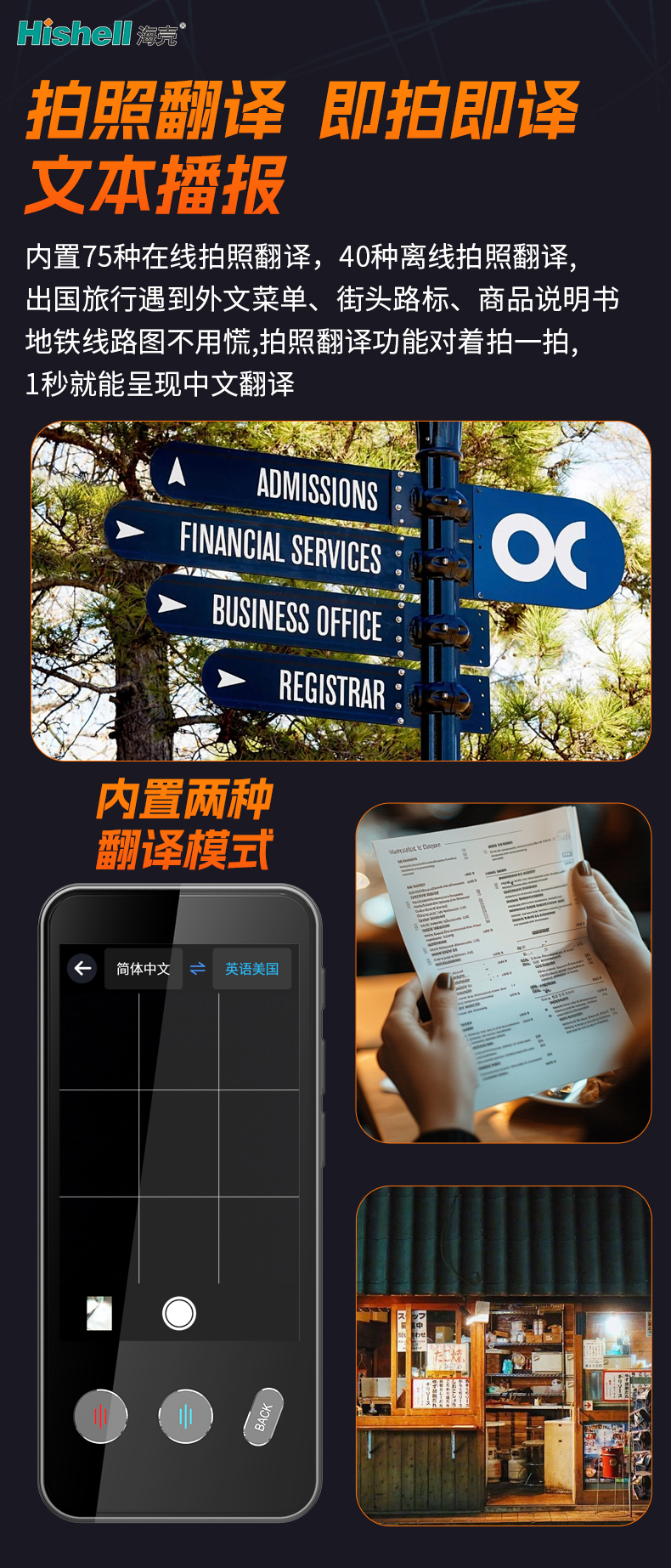 设备内置75种在线拍照翻译语种,40种离线拍照翻译语种,覆盖全球主流及小众语言,无论身处网络通畅的繁华街区,还是信号薄弱的偏远地段,都能稳定发挥作用。出国旅行时,遇到外文菜单、街头路标、商品说明书、地铁线路图等场景无需慌张,无需繁琐操作,拍照翻译功能一键搞定,帮你快速读懂信息、顺畅出行,彻底摆脱语言障碍的困扰,让跨国之旅更轻松、更安心。