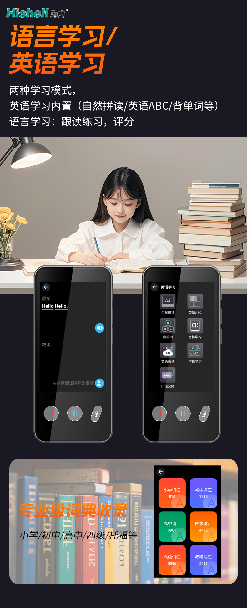 机身轻便易携带,随时随地可开启学习,既能快速翻译打破语言障碍,又能利用碎片时间开展英语练习,让学习更高效、更灵活,助力用户轻松提升英语综合能力。