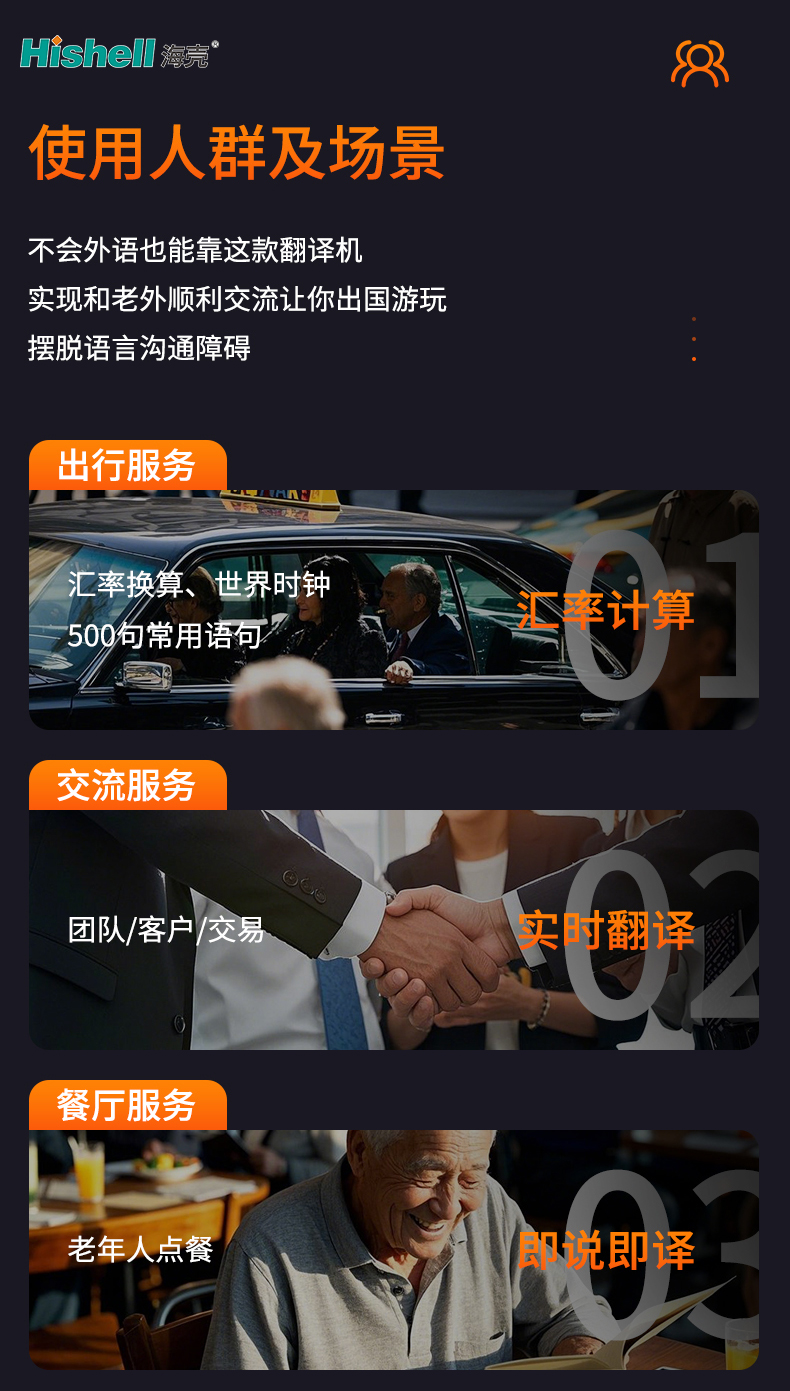 这款翻译机专为无外语基础人群设计,轻松解决跨语言沟通难题,让不会外语的人也能与老外顺畅交流,彻底摆脱出国游玩的语言障碍,是出境出行的必备神器。其适配多种高频出行场景,精准覆盖出行服务、交流服务、餐厅服务三大核心需求,全方位满足日常沟通所需。
