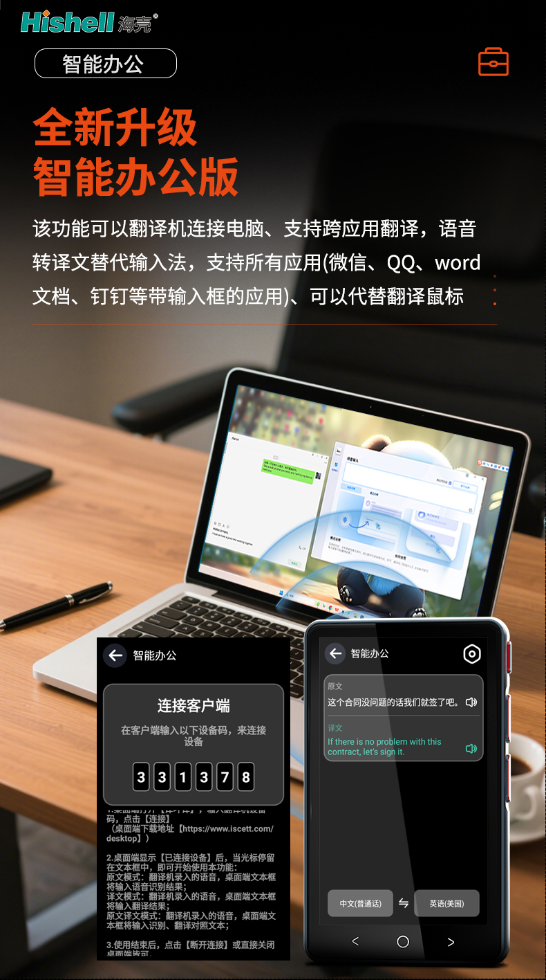 全新升级的智能办公版翻译机,堪称职场人的效率神器!它可轻松连接电脑,打破设备壁垒,实现跨应用无缝翻译,彻底告别切换软件的繁琐。核心亮点在于语音转译文功能,直接替代传统输入法,说话即出文字,大幅提升输入效率,还能避免打字失误。