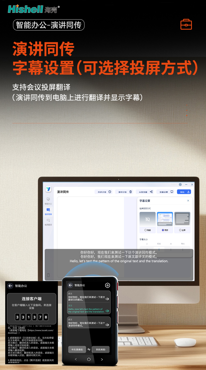 这款翻译机专为各类演讲、会议场景打造,核心亮点在于精准的演讲同传功能,实时转换发言内容,同步输出译文,告别语言沟通障碍。支持灵活字幕设置,你可根据需求自定义字幕样式,还能自由选择投屏方式,适配不同场地设备。尤其适用于会议场景,能实现演讲同传到电脑的专属功能,译文字幕同步在电脑端显示,无论是现场参会者还是线上观众,都能清晰获取核心信息。操作便捷,无需复杂调试,轻松助力跨国会议、学术演讲、商务洽谈等各类场景,让沟通更高效、更顺畅。
