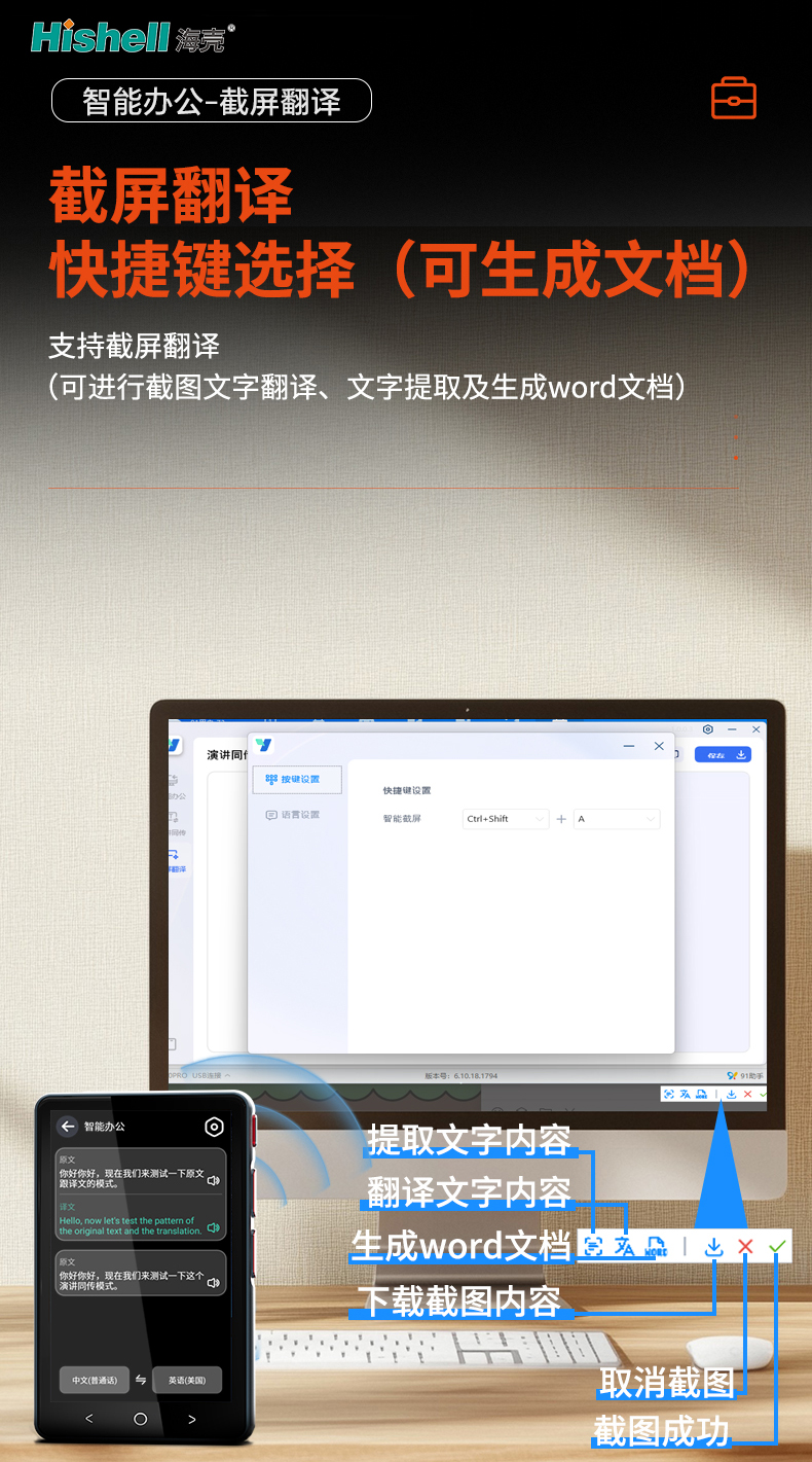 这款翻译机主打高效截屏翻译功能,搭配便捷快捷键操作,轻松适配各类场景使用。只需一键触发快捷键截取目标画面,即可快速完成画面中文字的翻译与提取,支持多语言精准互译,识别准确率高。更实用的是,提取后的文字可直接生成Word文档,无需手动二次录入,极大节省整理时间。无论是浏览外文网页、查看海外资料,还是处理跨境工作文件,都能凭借其便捷操作与强大功能,帮你打破语言壁垒,提升处理效率,是学习、工作与出行的优质助手。