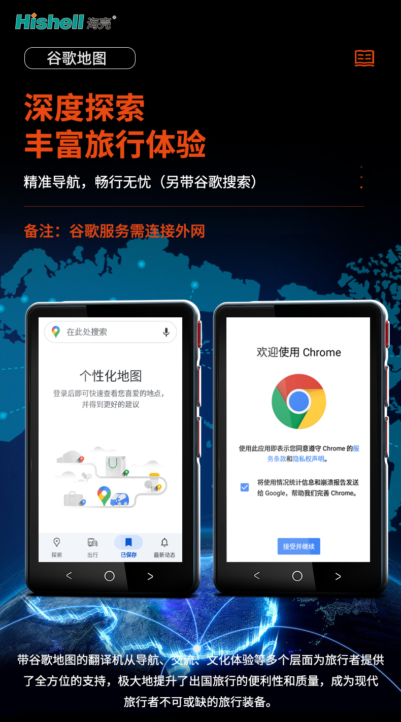 这款翻译机以“深度探索,丰富旅行体验,精准导航,畅行无忧”为核心定位,更搭载谷歌搜索功能(备注:谷歌服务需连接外网),从导航、交流、文化体验等多个层面为旅行者提供全方位支持,是现代出国旅行不可或缺的核心装备。