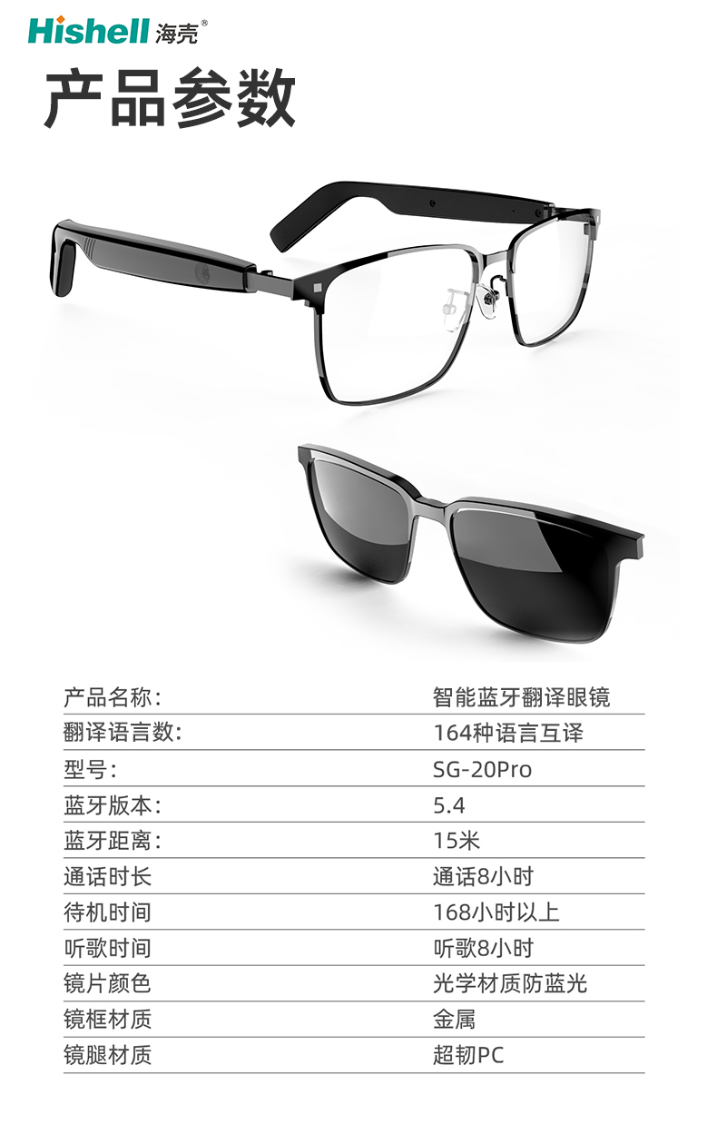 产品名称:智能蓝牙翻译眼镜 翻译语言数:164种语言互译