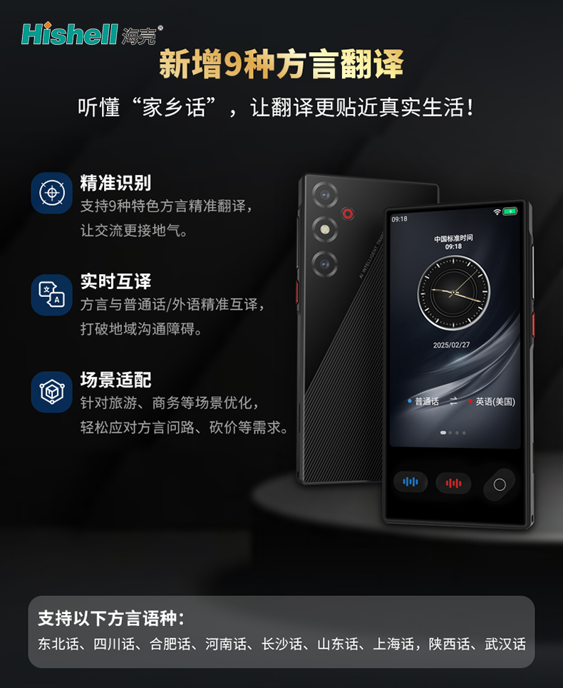 这款智能翻译机新增 9 种方言翻译功能,听懂 “家乡话” 让翻译更贴近真实生活!支持 9 种特色方言精准识别与翻译,交流更接地气,告别方言沟通隔阂。