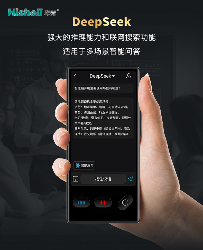这款智能翻译机搭载 DeepSeek 技术,凭借强大的推理能力与联网搜索功能,成为多场景智能问答好帮手。面对工作中的专业问题、学习时的知识盲区,或是生活里的实用咨询,都能快速推理分析、联网获取最新信息,精准解答需求。