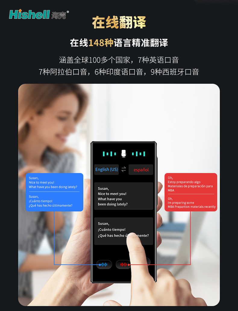这款智能翻译机主打在线 148 种语言精准翻译,覆盖全球 100 多个国家的主流语种,轻松应对跨国沟通需求。不仅支持通用语言翻译,更精准适配多样口音,包括 7 种英语口音、7 种阿拉伯语口音、6 种印度语口音、9 种西班牙语口音,避免因口音差异导致的翻译偏差。