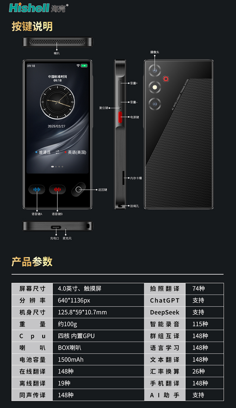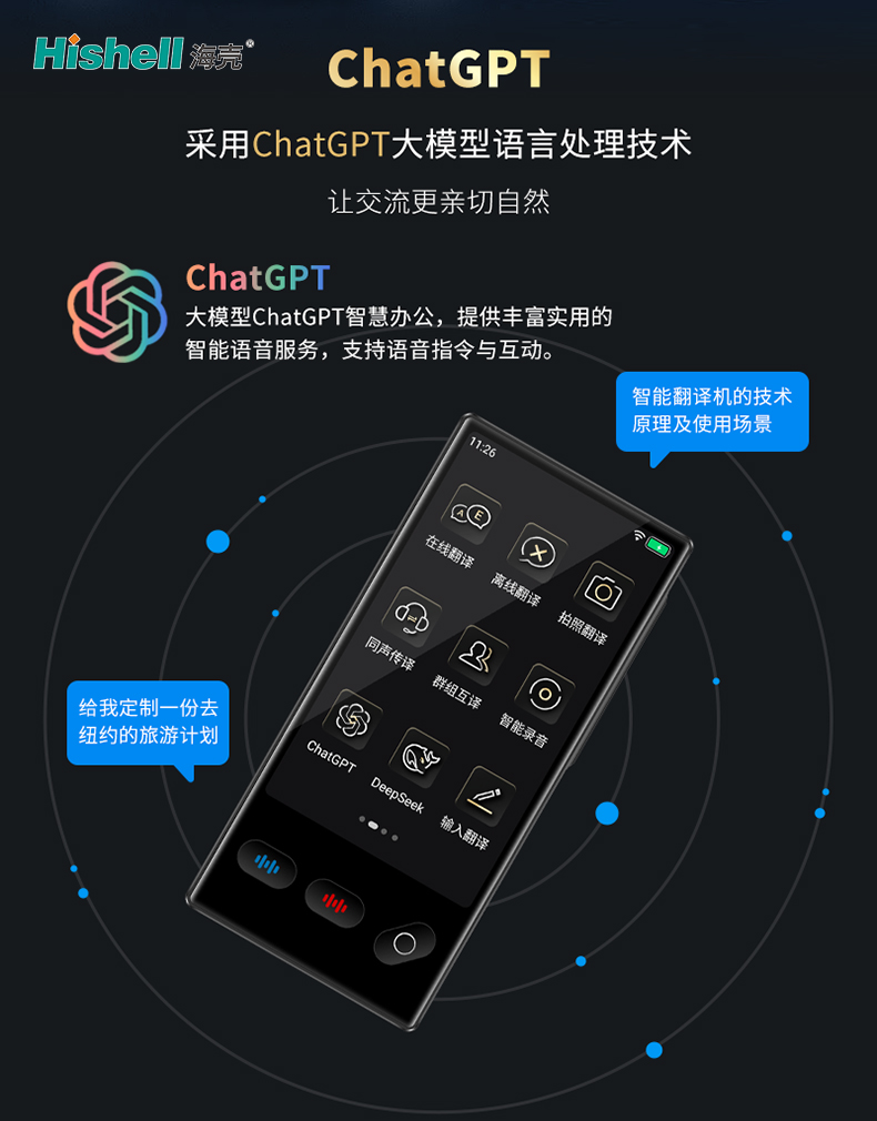 同声传译结果可与手机实时共享,群组互译支持多人多国语言群聊,还能实现手机与翻译机对话翻译。搭载 ChatGPT 智能助手与 DeepSeek 技术,不仅能录音备忘实时转译,还可写代码、读文件、创作创意内容。