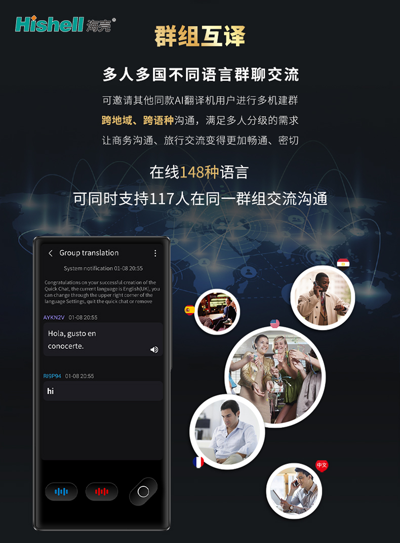 这款翻译机的群组互译功能,轻松解决多人多国跨语言交流难题。支持邀请其他同款 AI 翻译机用户多机建群,无论身处不同地域,使用不同语种,都能实现顺畅群聊沟通。