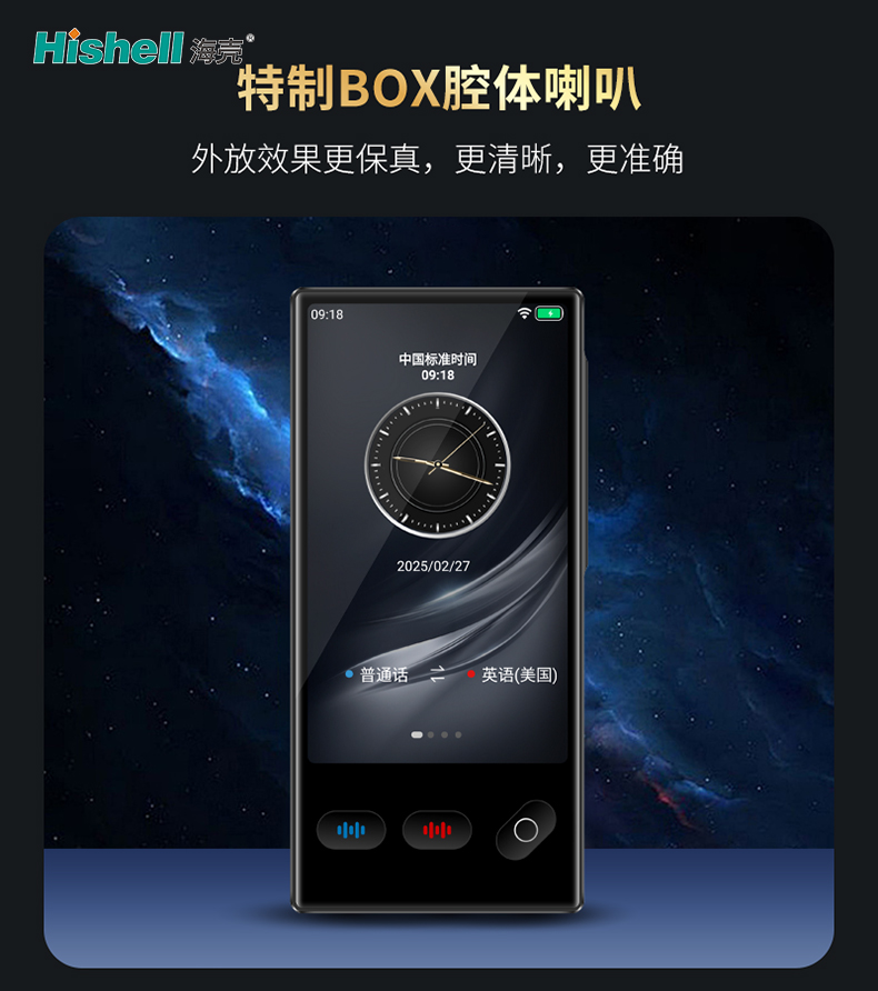 这款翻译机搭载特制 BOX 腔体喇叭,从听觉维度升级跨语言沟通体验,让语音译文外放更保真、更清晰、更准确,告别模糊杂音的困扰。