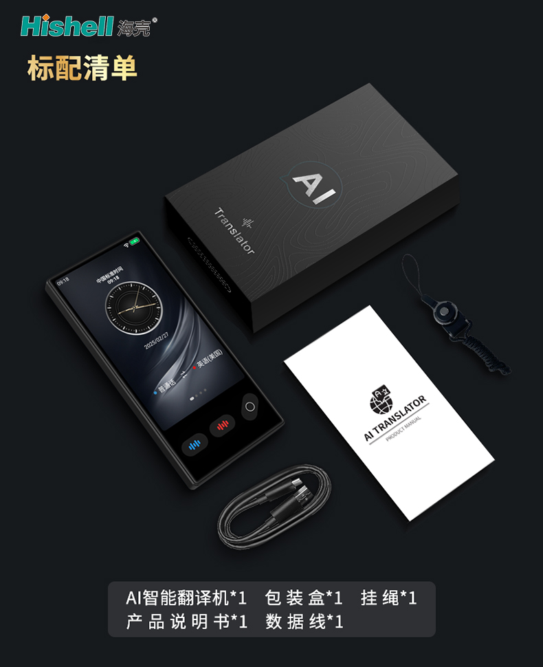 标配清单:AI智能翻译机*1,包装盒*1,挂绳*1,产品说明书*1,数据线*1